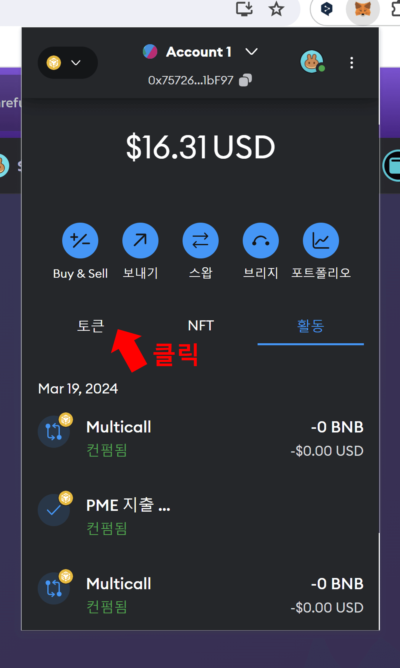 화면 우측상단에 '메타마스크 이모티콘'을 클릭합니다.