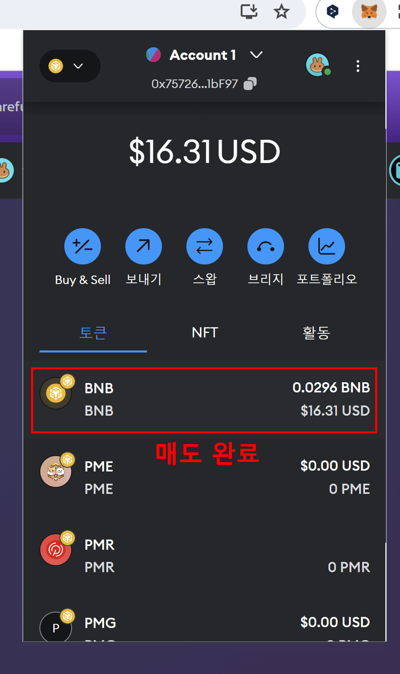 매도(스왑)된 BNB가 보입니다. 해외거래소로 입금 후, 해외거래소에서 국내거래소(BEP2)로 출금 및 현금화가 가능합니다.