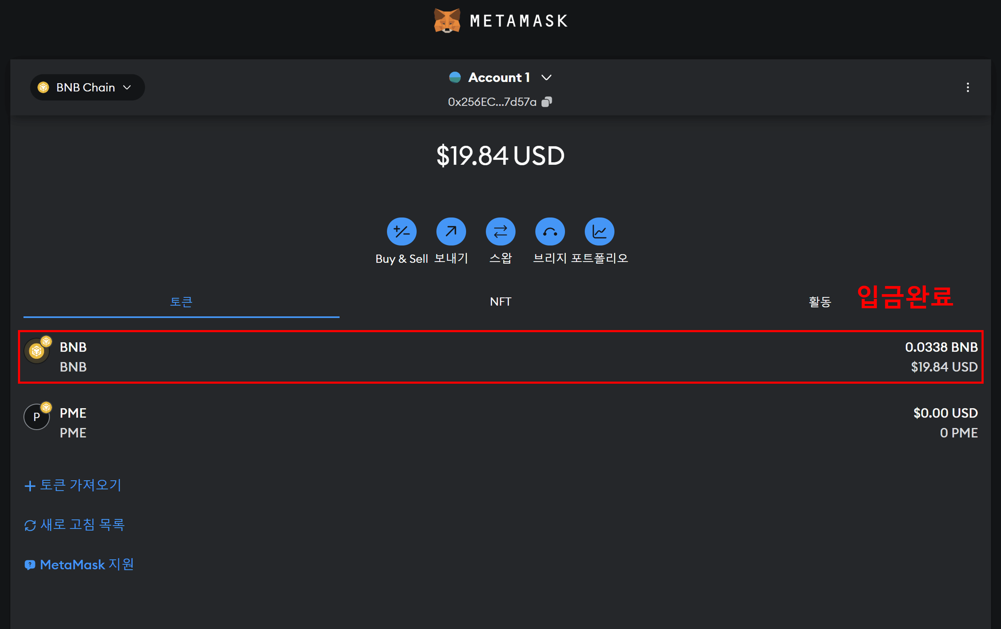 출금이 완료되면, 메타 마스크 지갑에 BNB가 입금되었는지 확인이 가능합니다.