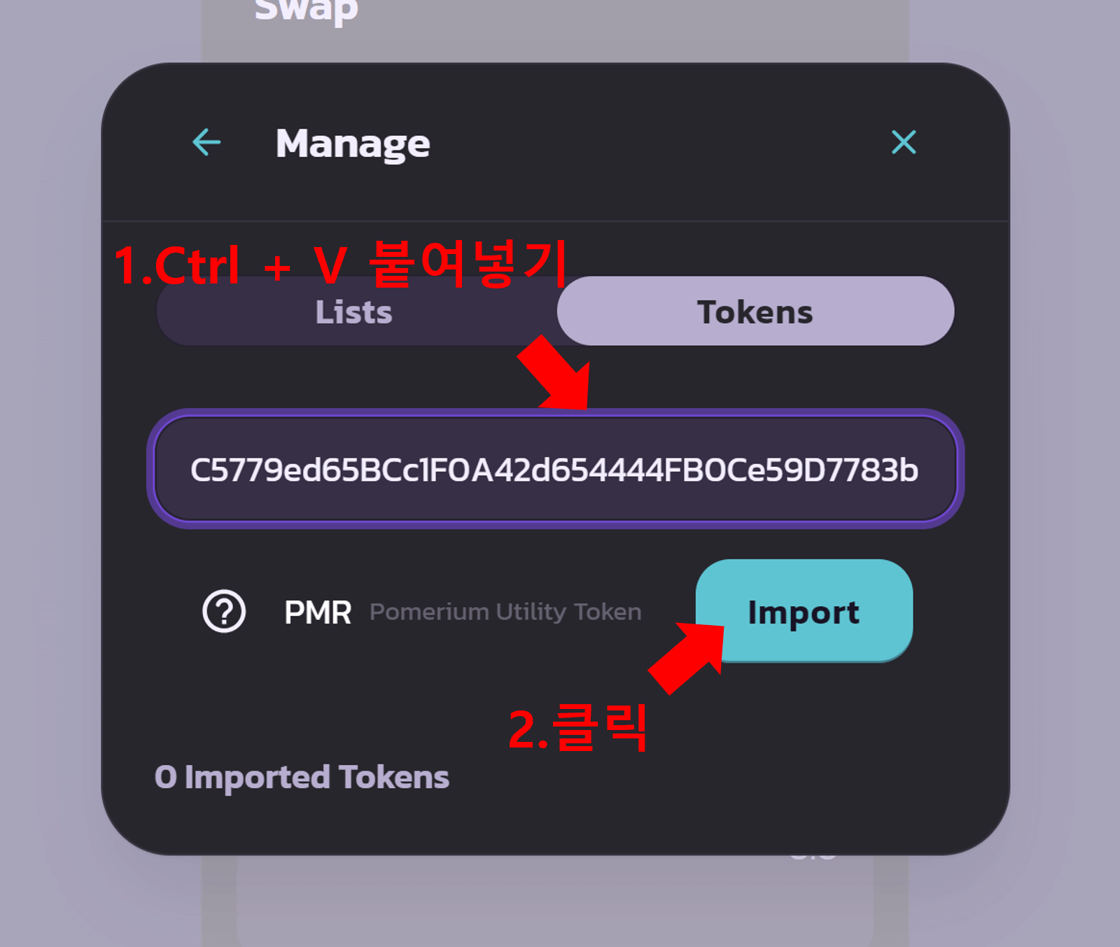 1. 스마트 컨트랙트 주소란에 'Ctrl + V'로 붙여 넣기 합니다.