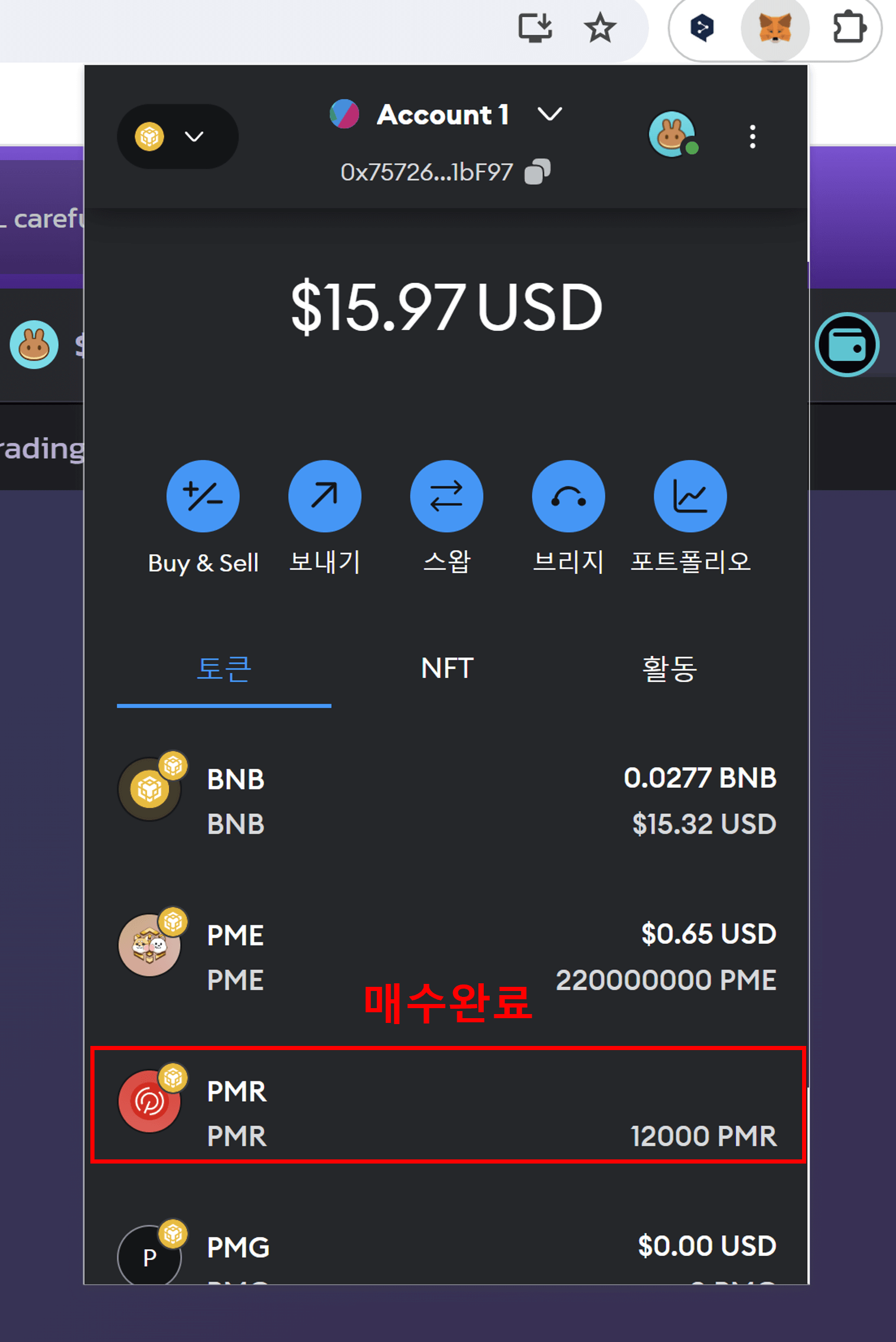 메타마스크 지갑에 로그인해서, 매수된 PMR 수량을 확인합니다.