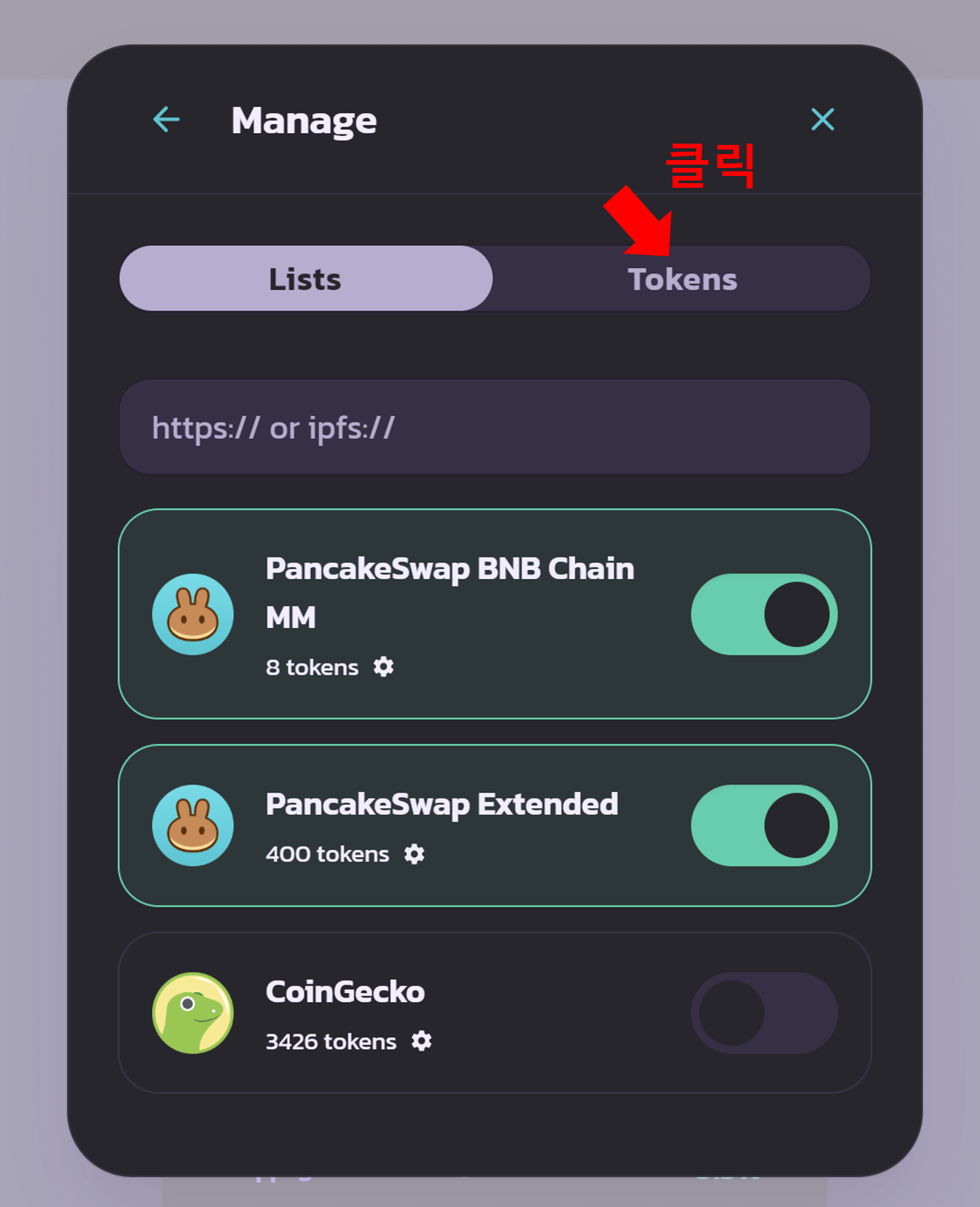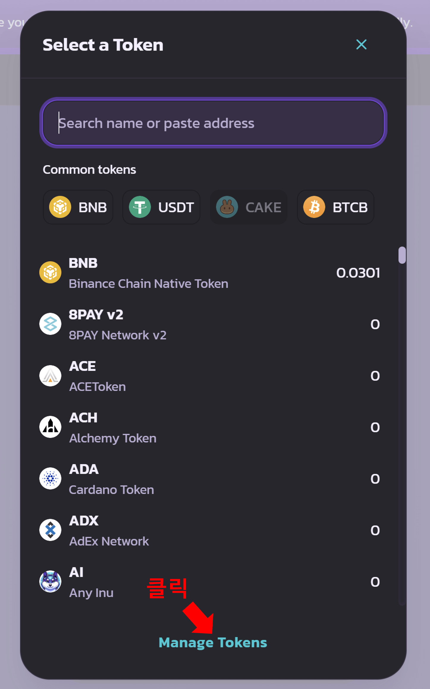 화면 하단에 'Manage Tokens'를 클릭합니다.