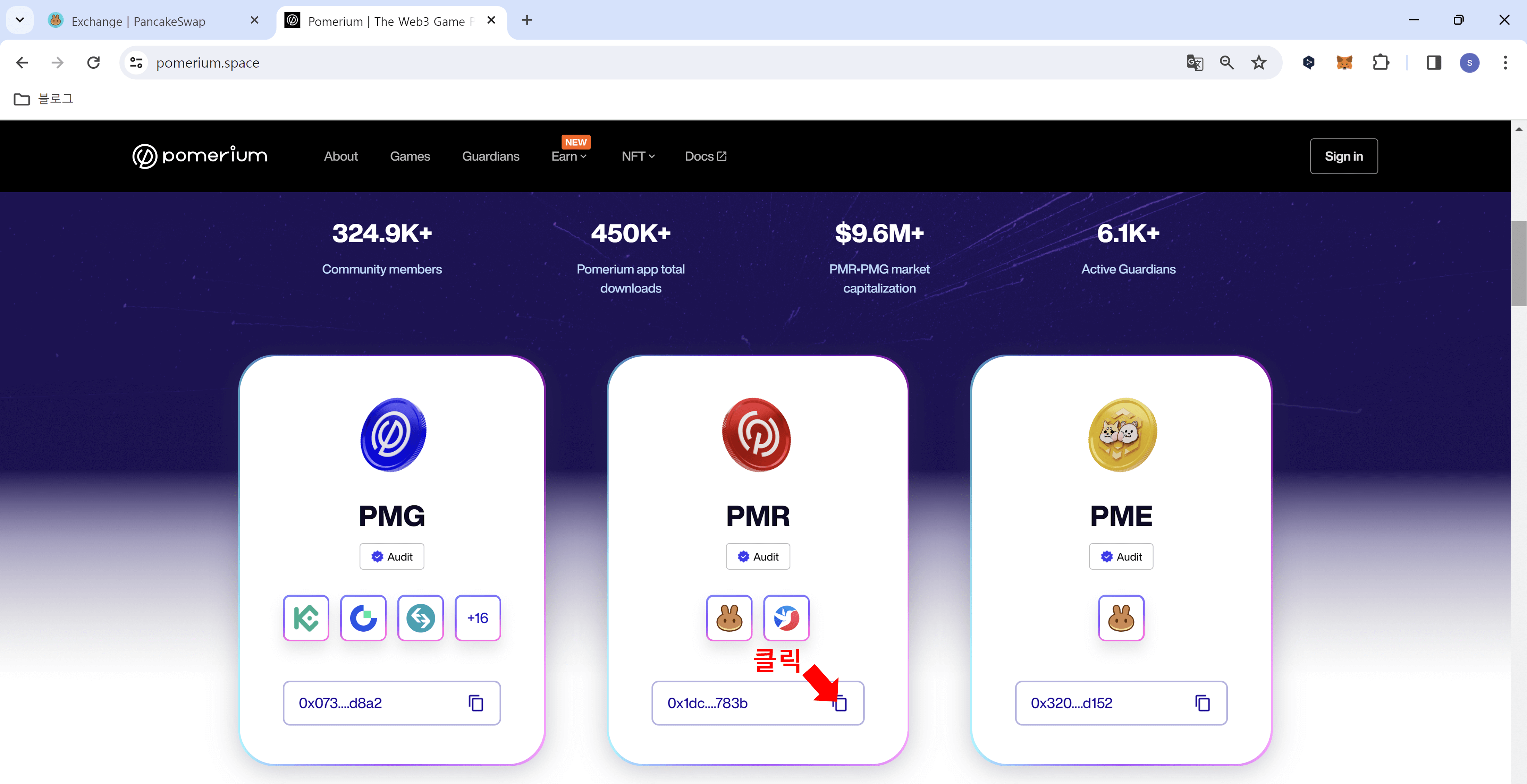 포메리움 홈페이지에서 스크롤바를 아래로 내리면, 각 토큰의 스마트 컨트랙트 주소를 복사할 수 있습니다.