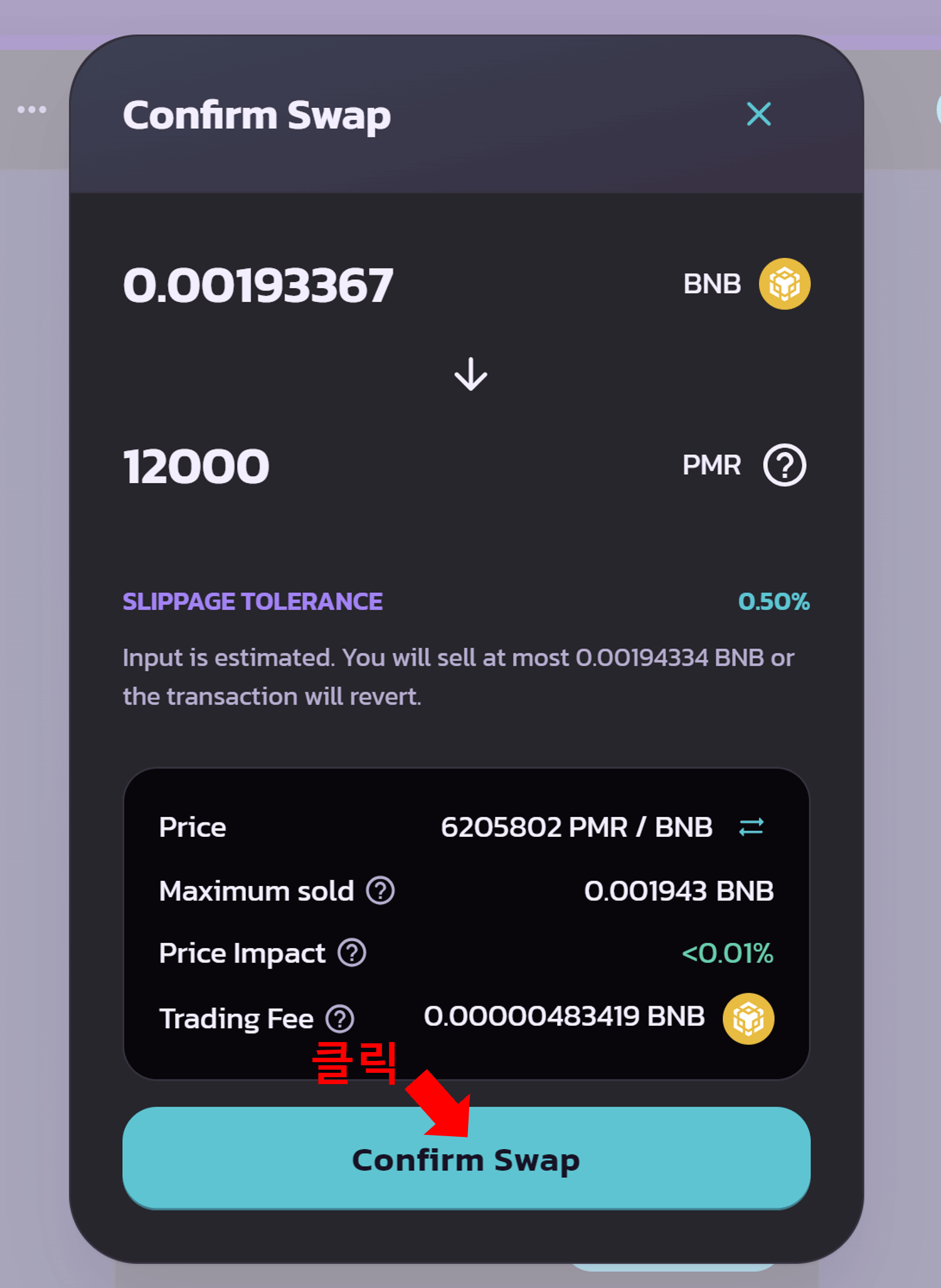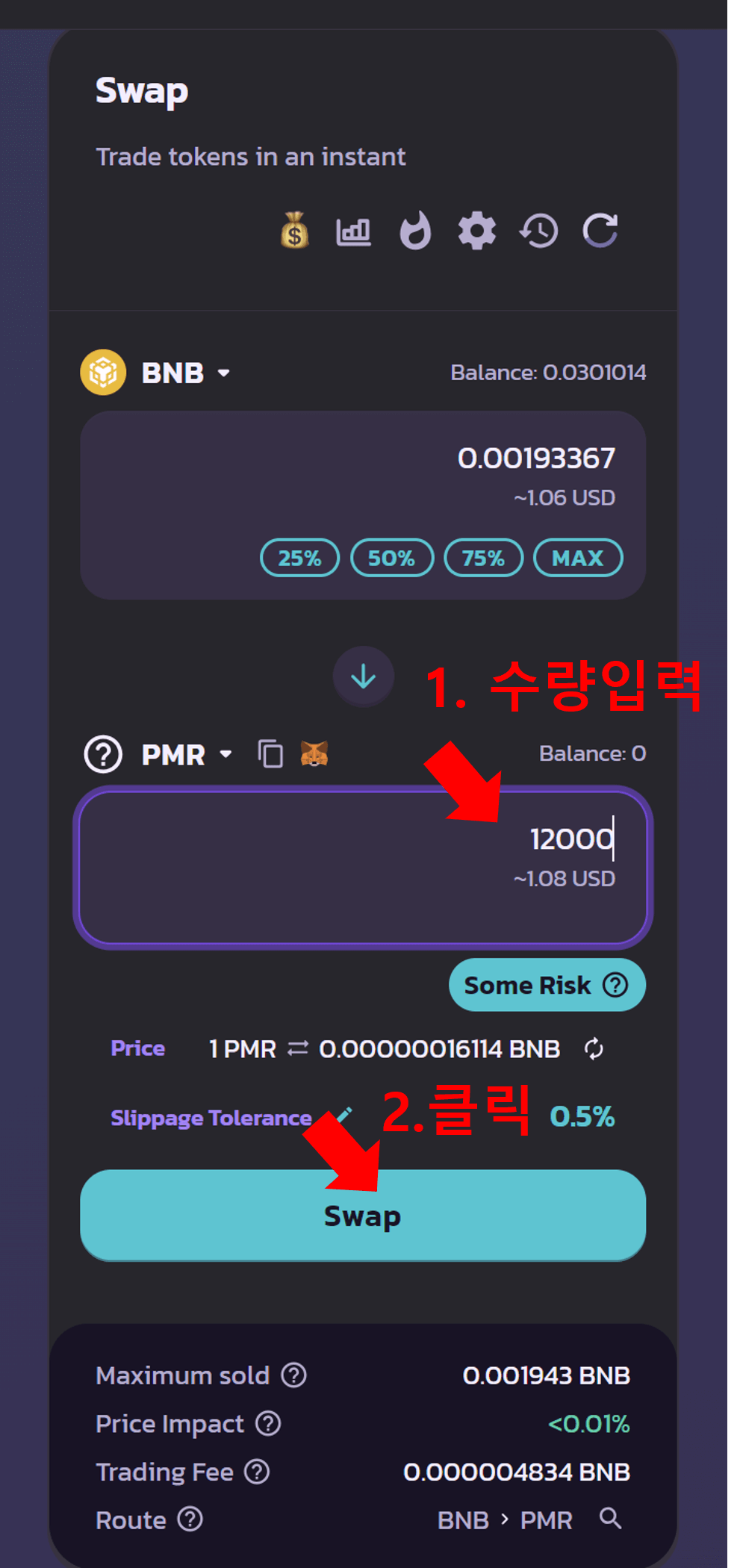 1. 매수할 PMR의 개수를 입력합니다. BNB가 가스비로 소모되므로, 적당하게 남겨두어야 합니다.