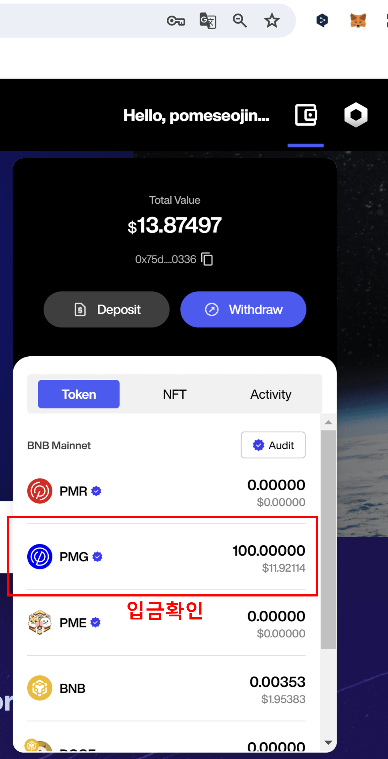 포메리움 지갑으로 입금된 PMG를 확인할 수 있습니다.