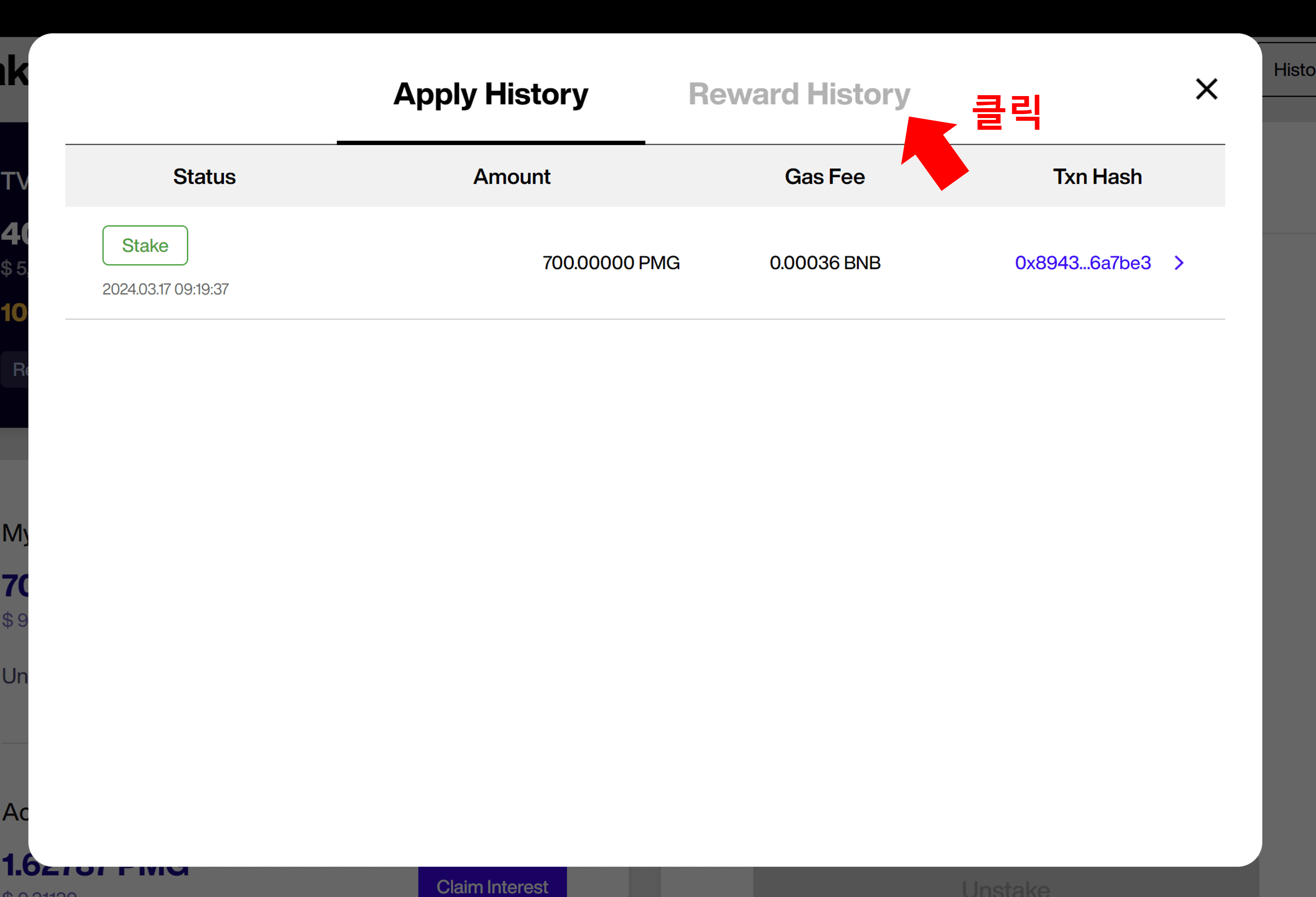 Apply History란은 Stake 내용이 확인되며, 추가로 스테이킹을 할 수 있습니다. 그러나, 스테이킹 한 시점부터 14일이 다시 시작되니 주의하시기 바랍니다. Cliam 또는 Unstake 내역도 확인할 수 있습니다.