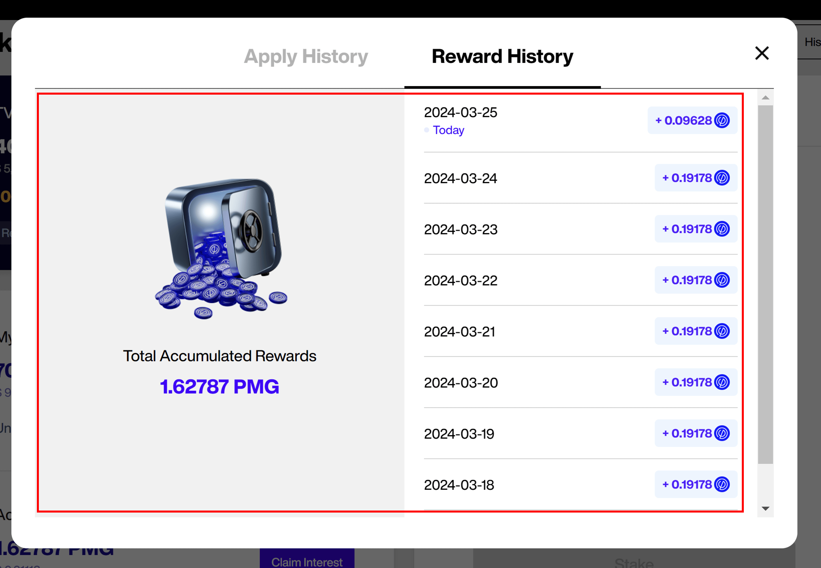 매일 보상으로 받는 PMG의 수량과 누적수량을 확인할 수 있습니다.