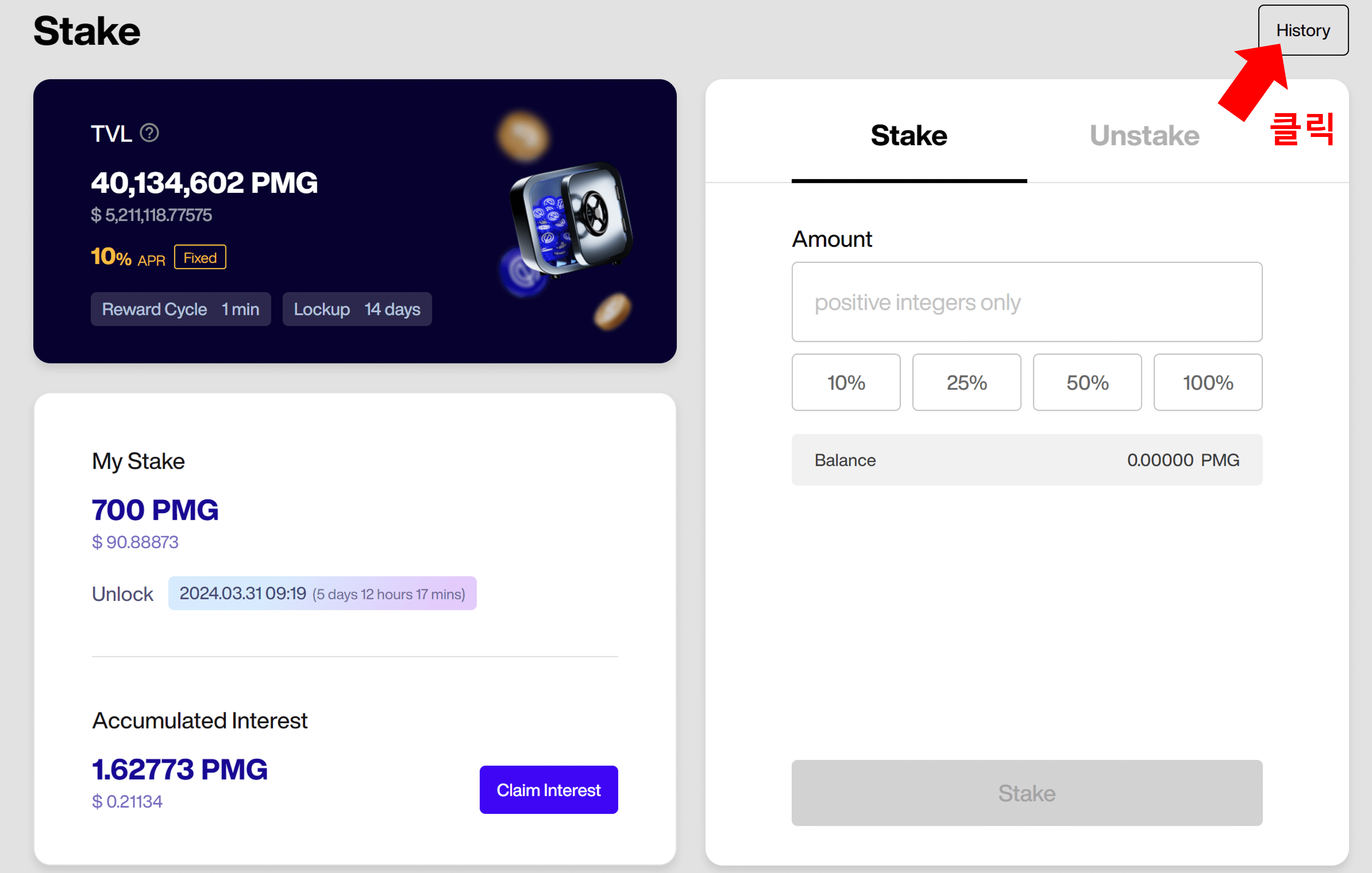 스테이킹을 하고, 세부사항을 확인하시려면, 오른쪽 상단에 'History'를 클릭합니다.